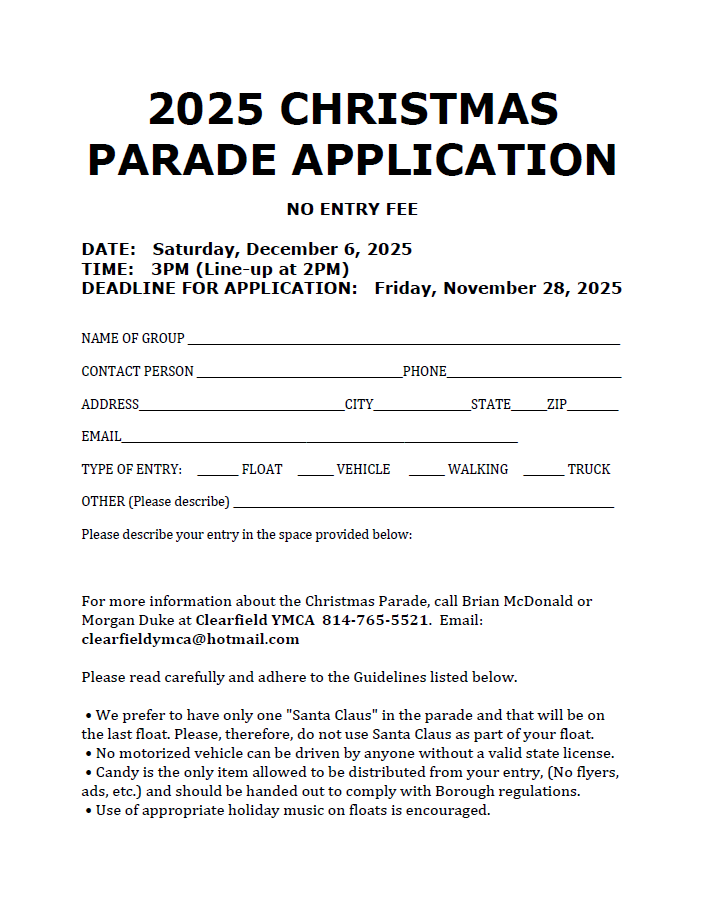 Help us welcome Santa to Clearfield with our annual Christmas Parade! Join us on the first Saturday of December at 3PM for the parade followed by a Santa party in our gymnasium. Kids will get a chance to meet Santa & Mrs. Claus, have some hot chocolate & cookies, and receive a stocking with holiday goodies.
